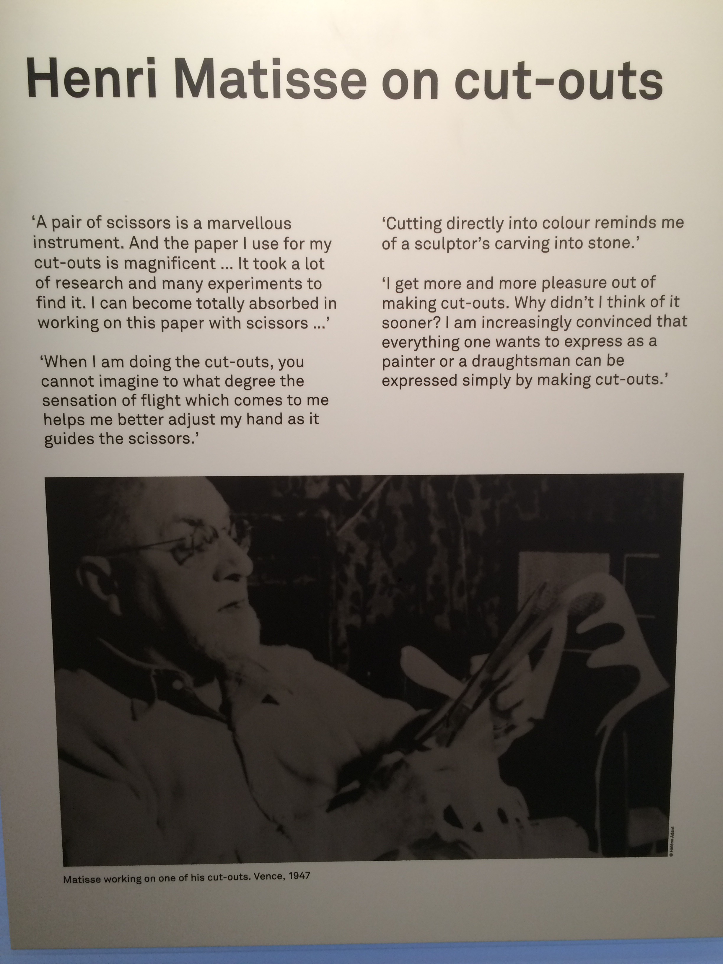 I saw Matisse’s ‘painting with scissors’ and now I am buzzing with ideas. Did you know Matisse was in a wheelchair and 80 when creating his cut outs. I have no reason to think it is ever too late to do anything!! Did you know he trained as a lawyer before switching careers? Think it; be it. Dream it; achieve it!