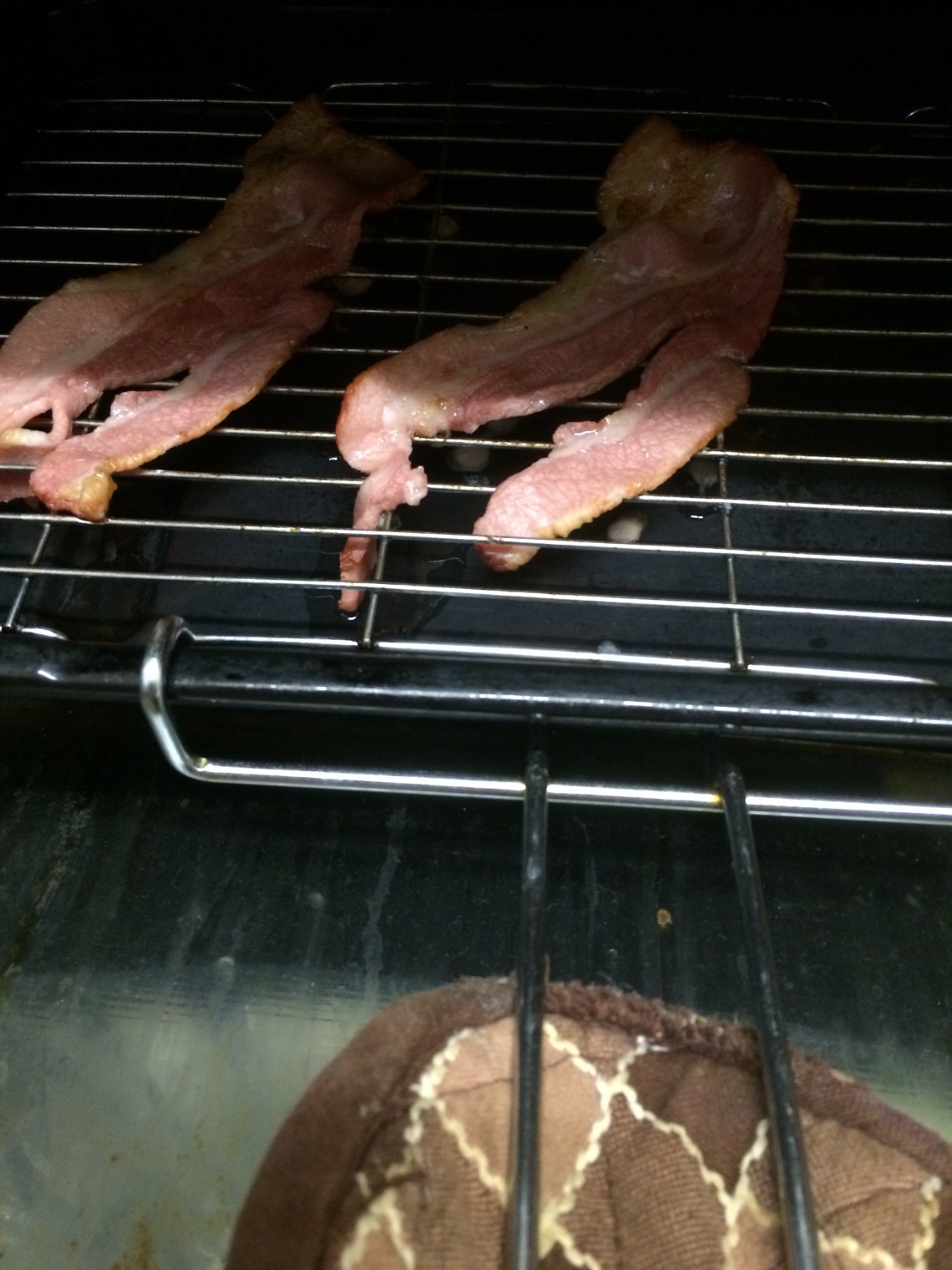 It’s hot in the kitchen anyway…and I don know if it’s cooked…(maybe it has to be browner…my son fried some bacon this morning … It was more-ish. Tsk…(I hate cooking…sometimes…most times)