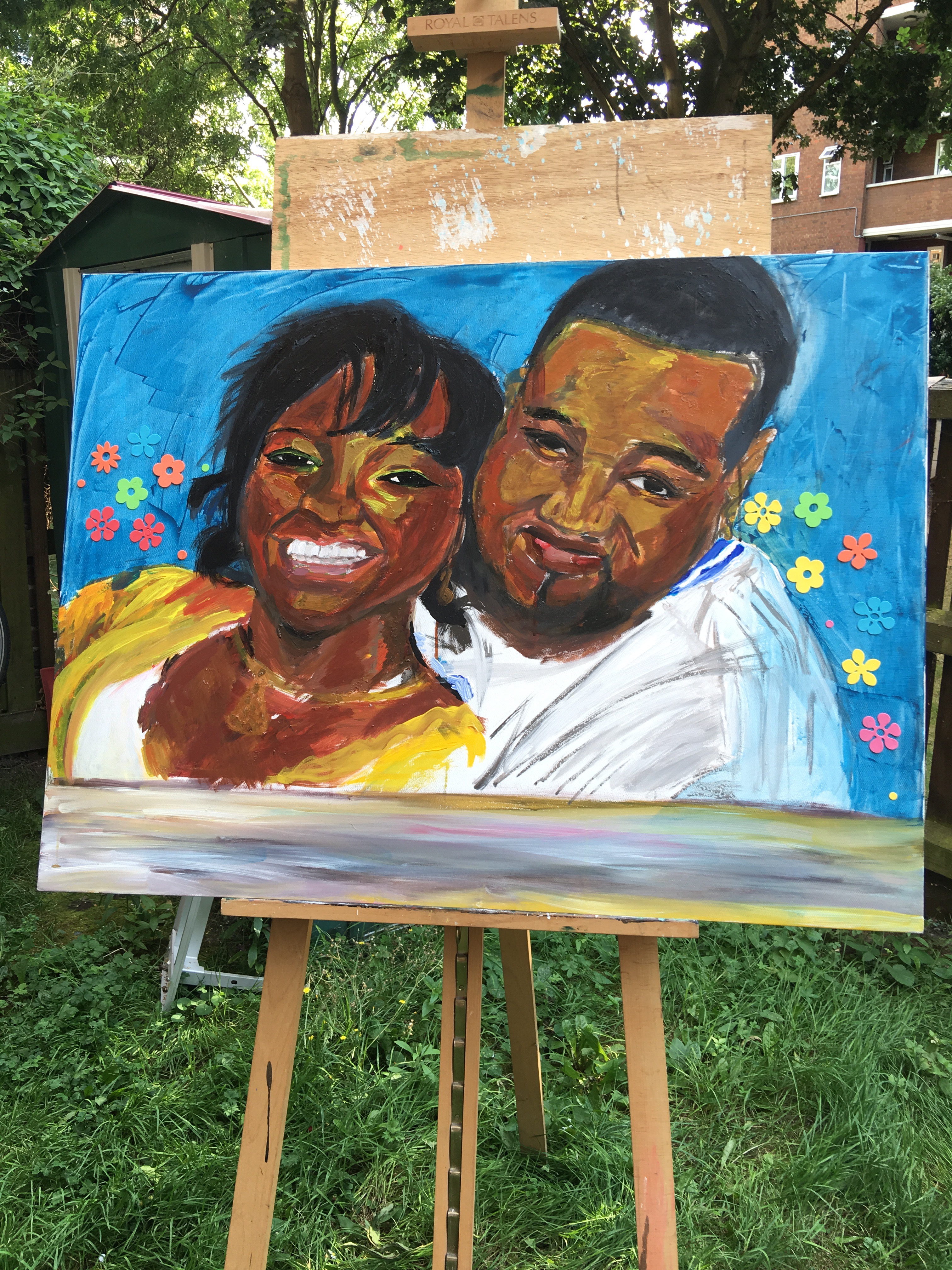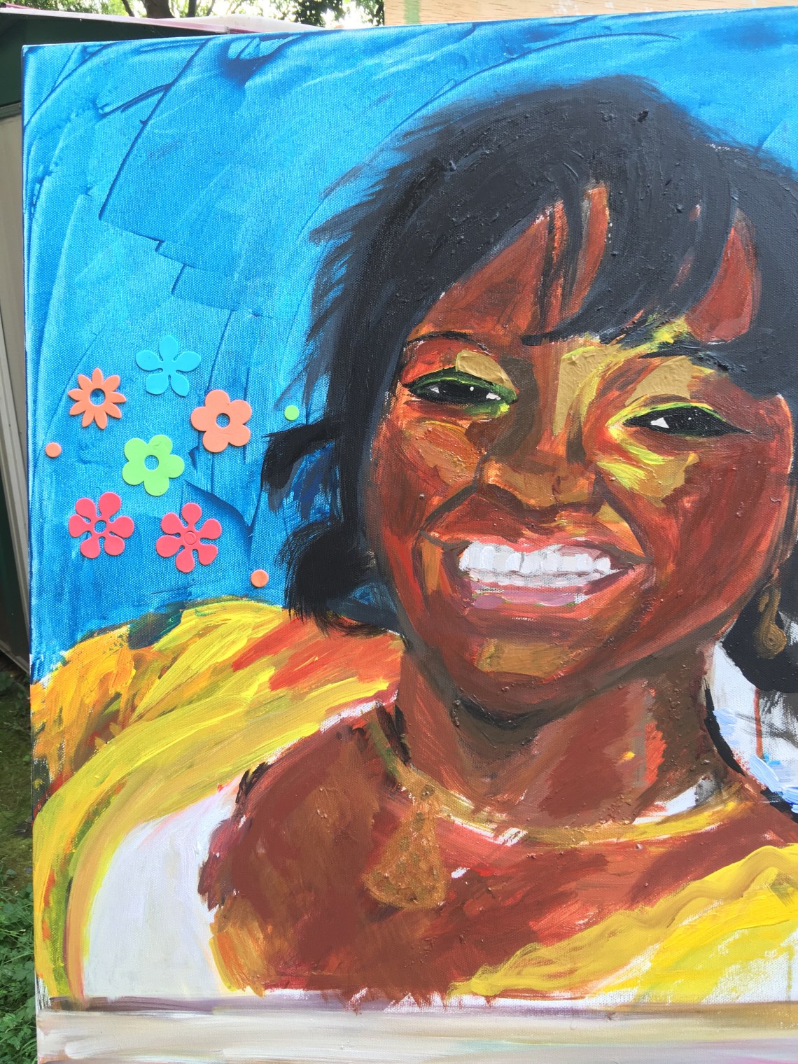 Okay back on course. I have just stuck on little foam flowers onto the painting ….just because. I mean I find (the smiles a bit too sickly sweet) ‘that is awful’ but I do…and if I’m going to paint from the photograph…I might as well endeavour to keep my sanity.