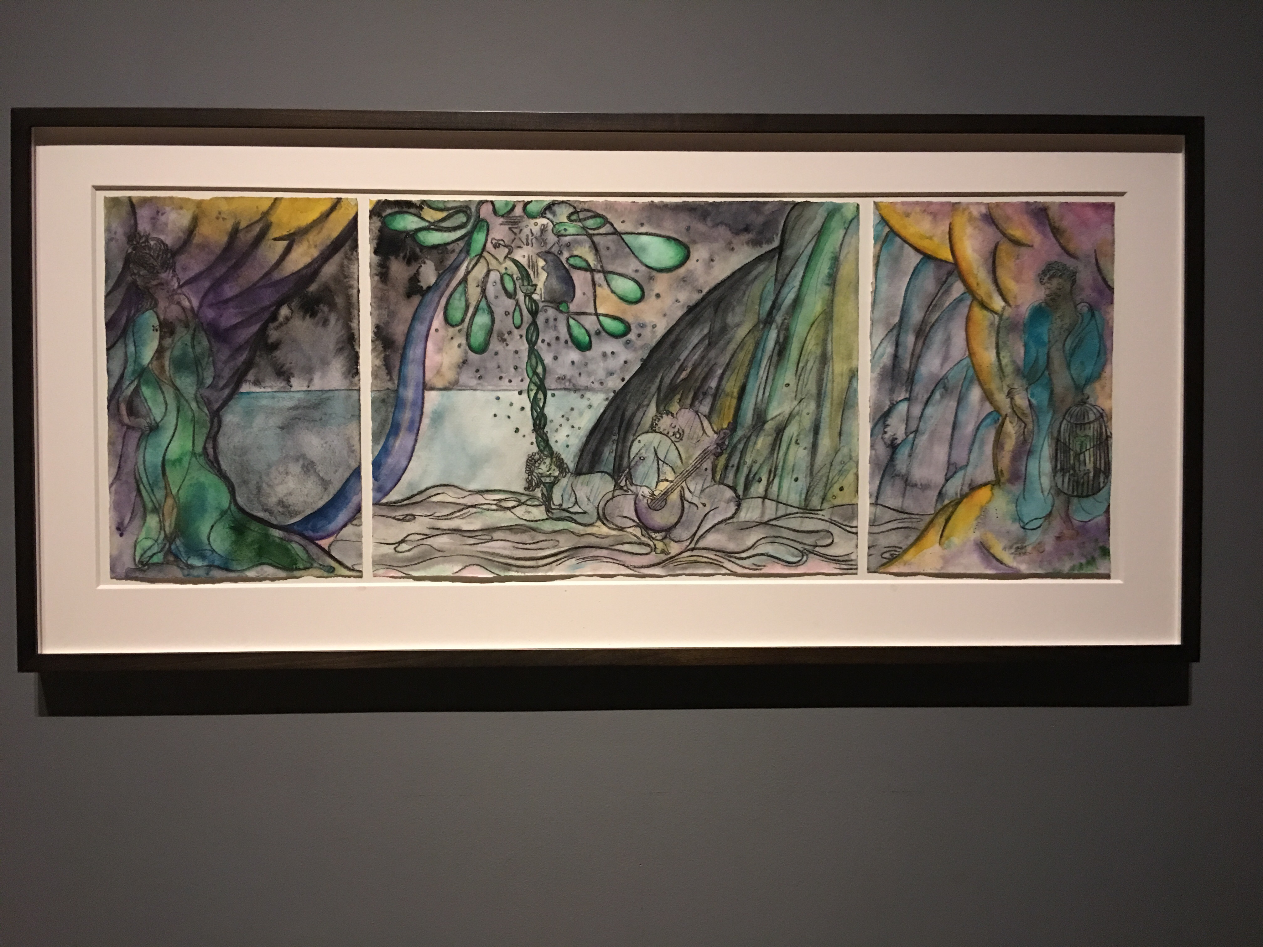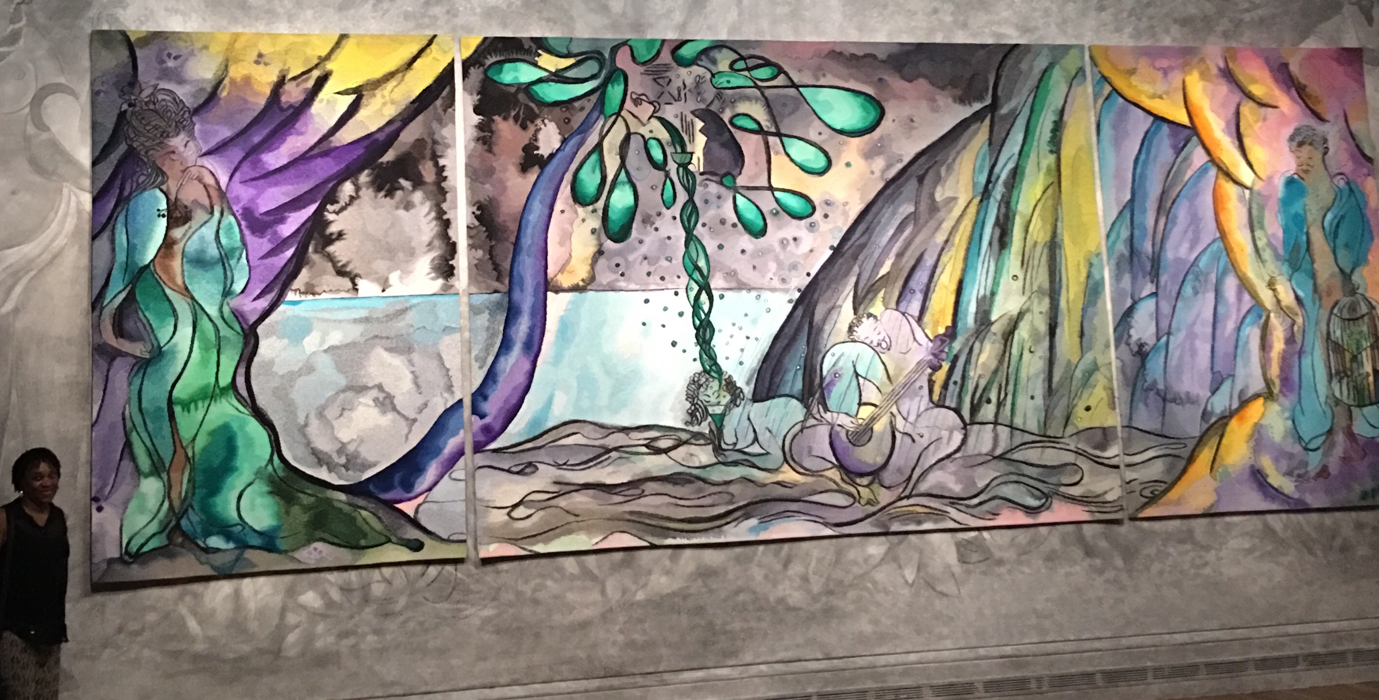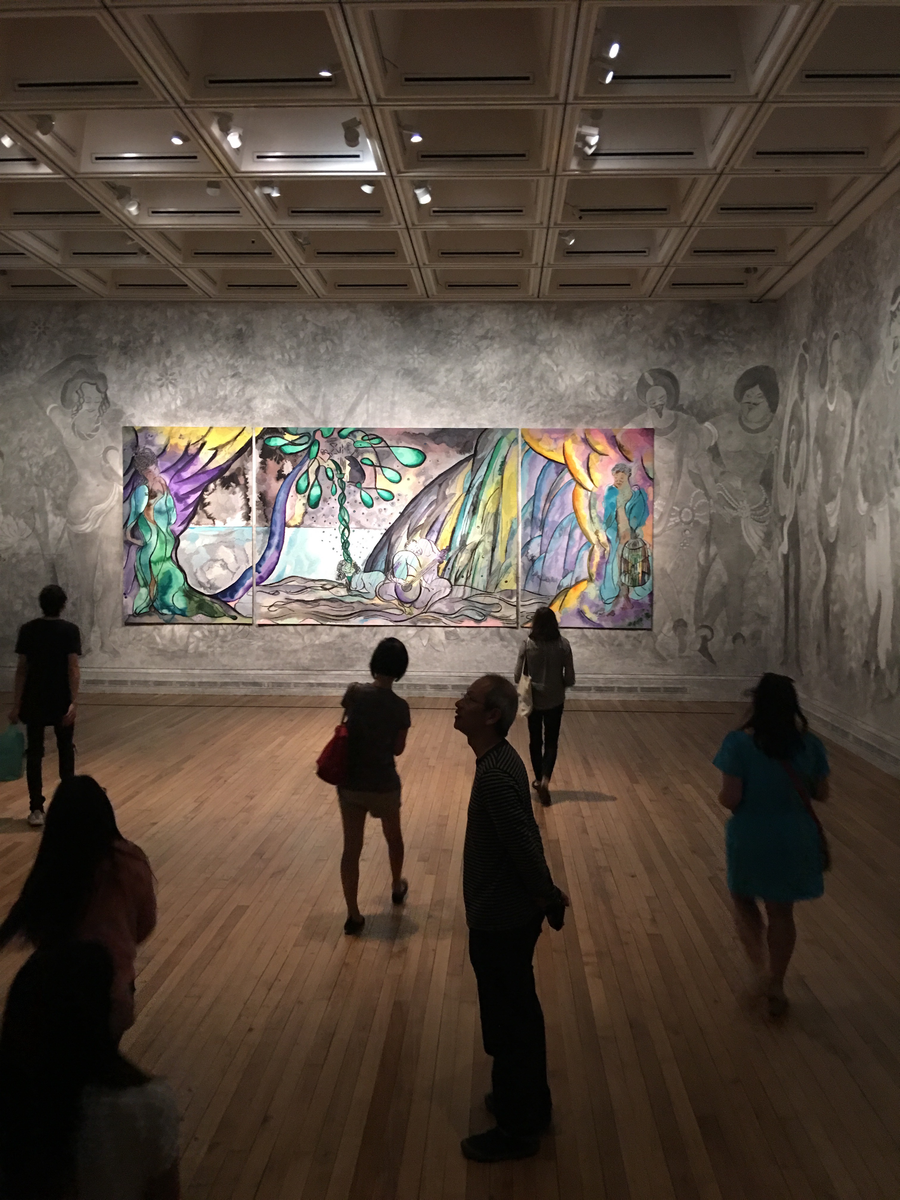As a backdrop Chris Ofili created a mural that encompasses the whole space….androgynous images…(seemingly inspired by the Greek god and goddesses) painted in monotone….so from afar very reminiscent of clouds (or grey mountain mist). The vibrancy of the triptych tapestry drew your eye. So alluringly magical.