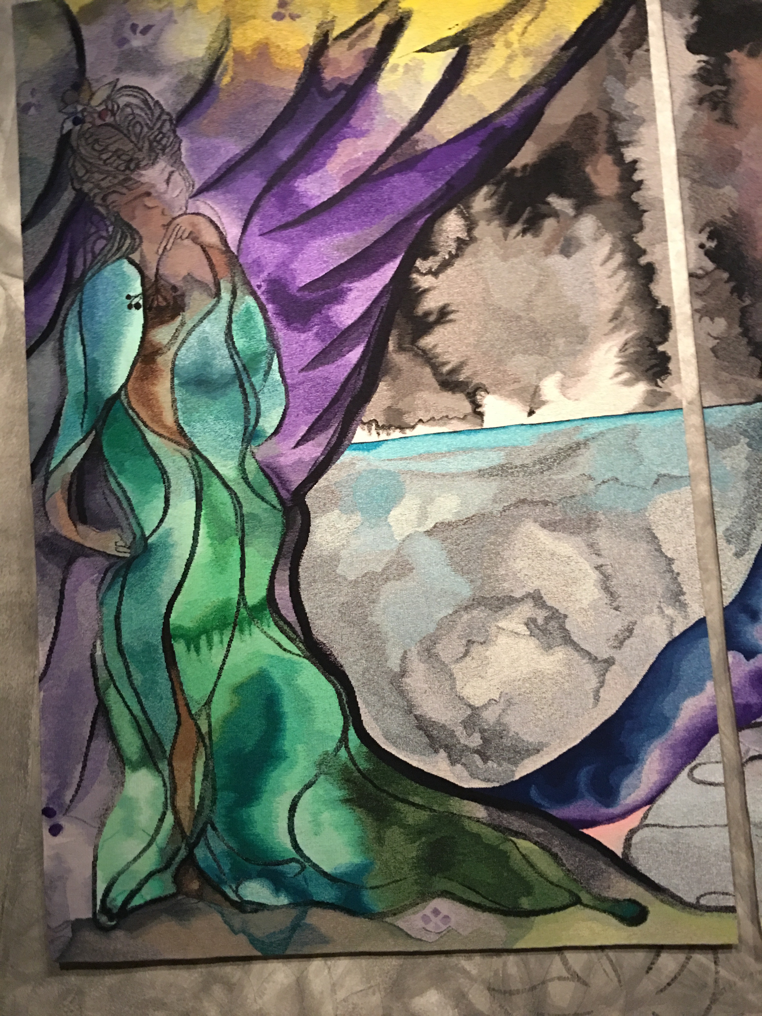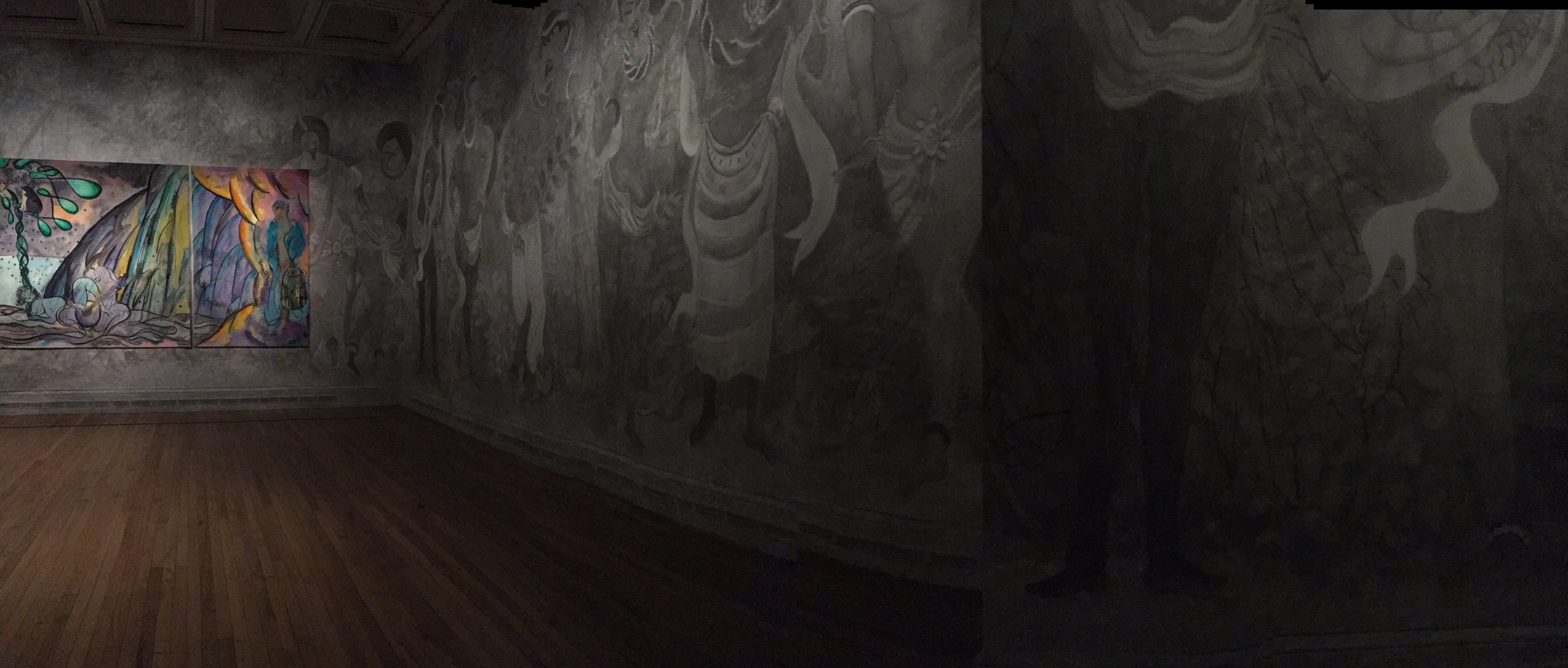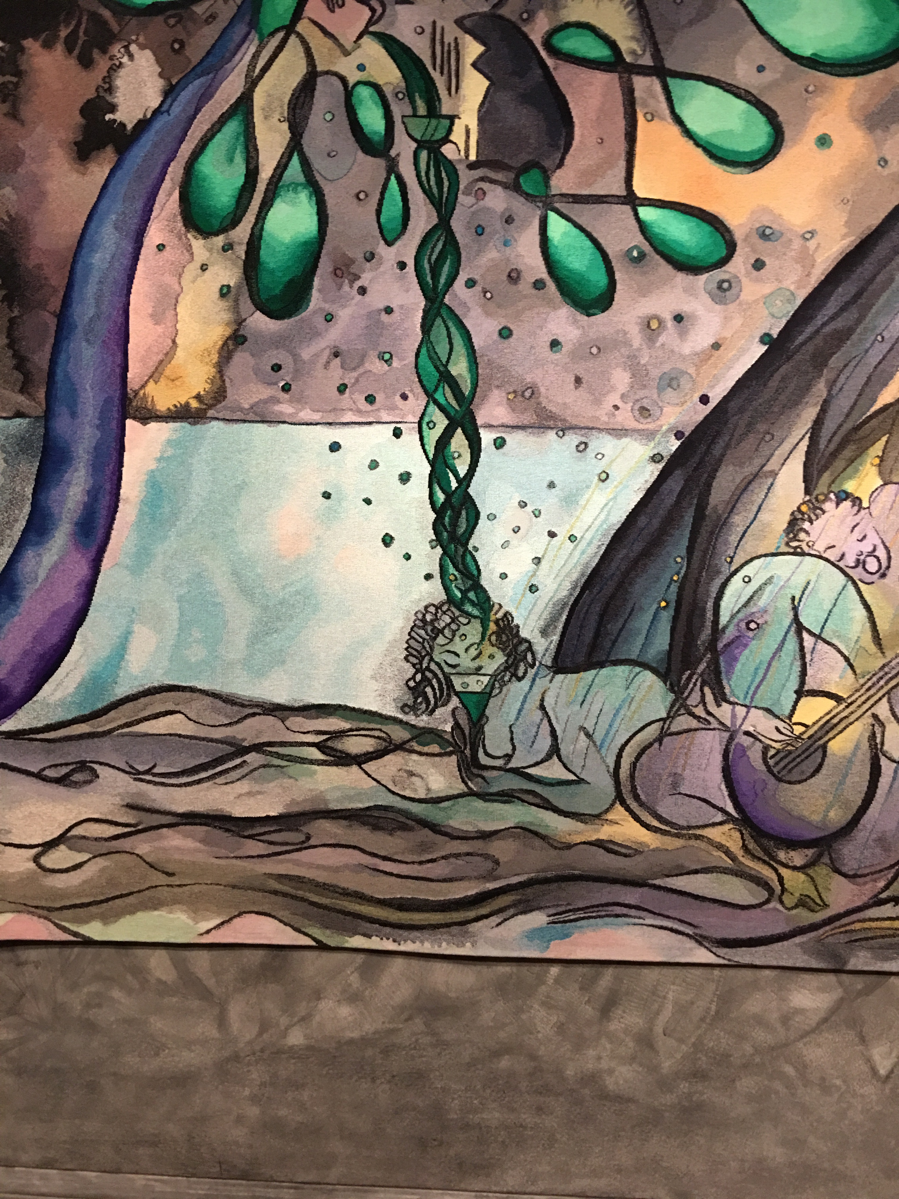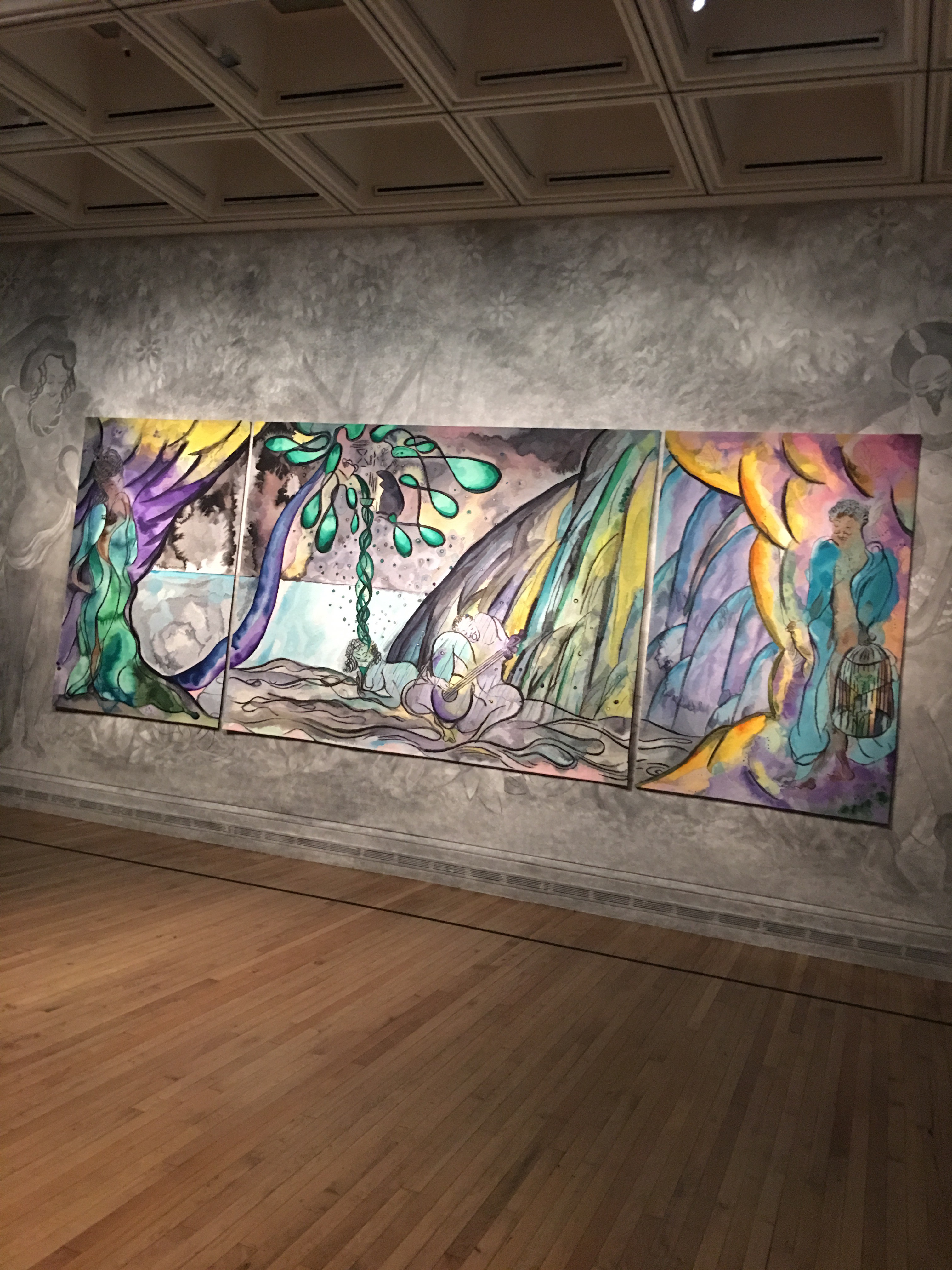 As a backdrop Chris Ofili created a mural that encompasses the whole space….androgynous images…(seemingly inspired by the Greek god and goddesses) painted in monotone….so from afar very reminiscent of clouds (or grey mountain mist). The vibrancy of the triptych tapestry drew your eye. So alluringly magical.